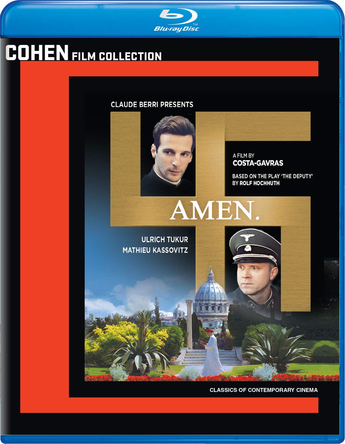 Amen. examines the links between the Vatican and Nazi Germany. The central character is Kurt Gerstein (Ulrich Tukur), a Waffen-SS officer employed in the SS Hygiene Institute, designing programs for the purification of water and the destruction of vermin. He is shocked to learn that the process he has developed to eradicate typhus, by using a hydrogen cyanide mixture called Zyklon B, is now being used for killing Jews in extermination camps. Gerstein attempts to notify Pope Pius XII (Marcel Iure?) about the gassings, but is appalled by the lack of response he gets from the Catholic hierarchy. The only person moved is Riccardo Fontana (Mathieu Kassovitz), a young Jesuit priest.