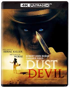 From out of the seething heat of the endless desert comes the nameless man (Robert John Burke, RoboCop 3, Thinner), his worn-down boot-heels tapping across the hard-baked earth. His old and ruthless spirit has smelled the town dying from afar and he has come to collect the souls to build his power. Soon the wasteland is littered with burned and disfigured remains and Ben Mukurob (Zakes Mokae, The Serpent and the Rainbow), the last policeman in the small town of Bethany, is faced with a mystery that threatens his eternal soul. Into this maelstrom of horror comes Wendy (Chelsea Field, Masters of the Universe), a young woman on the run from a broken marriage. Her flight has led her into the desert and perhaps into the arms of the Devil Himself. Filmmaking visionary Richard Stanley (director of the seminal cyberpunk shocker Hardware) has conjured a mystical mélange of windswept Spaghetti Western and hallucinatory horror/fantasy, spectacularly filmed on location in the Great Namib Desert of Africa. This Special Edition of Dust Devil includes Richard Stanley’s Director’s Cut and the original, altered Theatrical Cut – both versions gloriously restored in 4K!